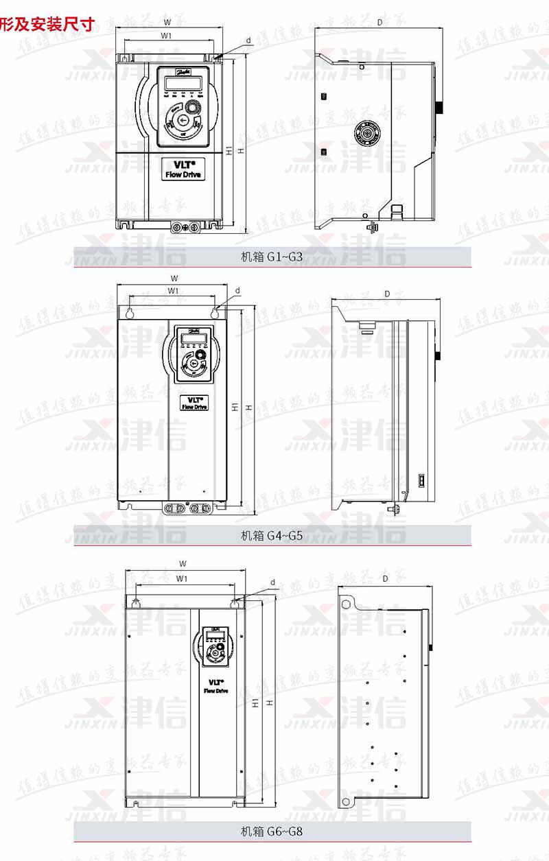 | 機箱型號 | 適配的功率范圍 (kW) | 外形尺寸 (mm) | ||||||