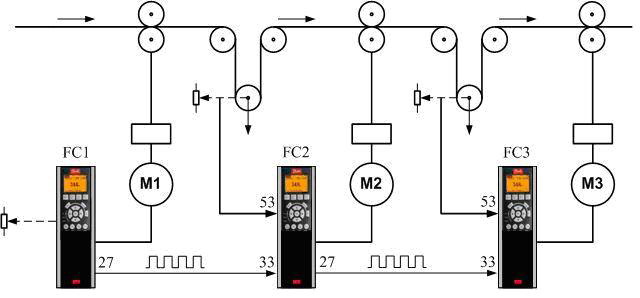 FC1工作在開環狀態。其速度輸出送往后段作為擴展PID控制的前饋輸入,可采用脈沖方式或模擬量方式。后段變頻器同時要引入此驅動器前側的跳舞輪處電位器反饋信號。理想狀態是在跳舞輪處于最佳位置時,電位器位于5V位置。