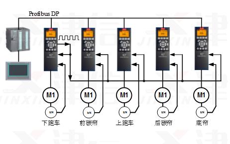 驅(qū)動(dòng)系統(tǒng)的整體結(jié)構(gòu)如圖四,每根軸獨(dú)立按自己的電子凸輪曲線運(yùn)行,屬于典型的分布式控制系統(tǒng),對(duì)主控制器的性能要求,一般的PLC就能勝任。由于每根軸都與主軸保持電子凸輪同步關(guān)系,所以總體上可以實(shí)現(xiàn)多軸同步的控制需求。其中下跑車運(yùn)動(dòng)控制器比較特殊,他具有虛擬主軸脈沖輸出的功能,代替主控制器發(fā)送主軸脈沖信號(hào)。