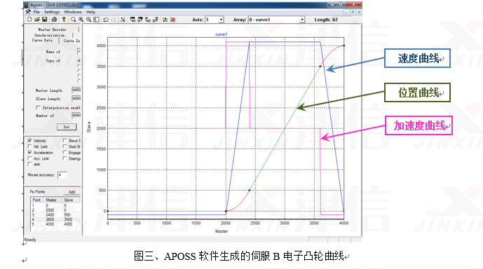 丹佛斯MCO305的開發(fā)軟件為APOSS,內(nèi)置電子凸輪曲線生產(chǎn)功能,加上述計(jì)算得到的a、b、c、d、e 五點(diǎn)電子凸輪曲線特征點(diǎn)按軟件要求填入表格,就能自動(dòng)生成如圖三所示的電子凸輪曲線。